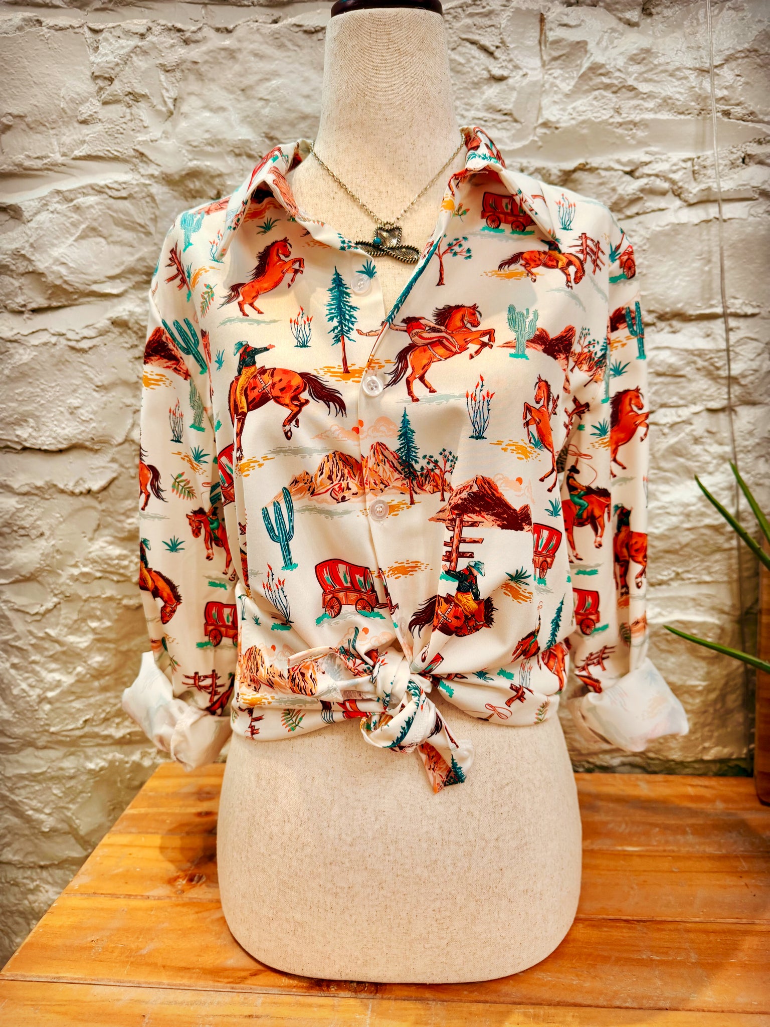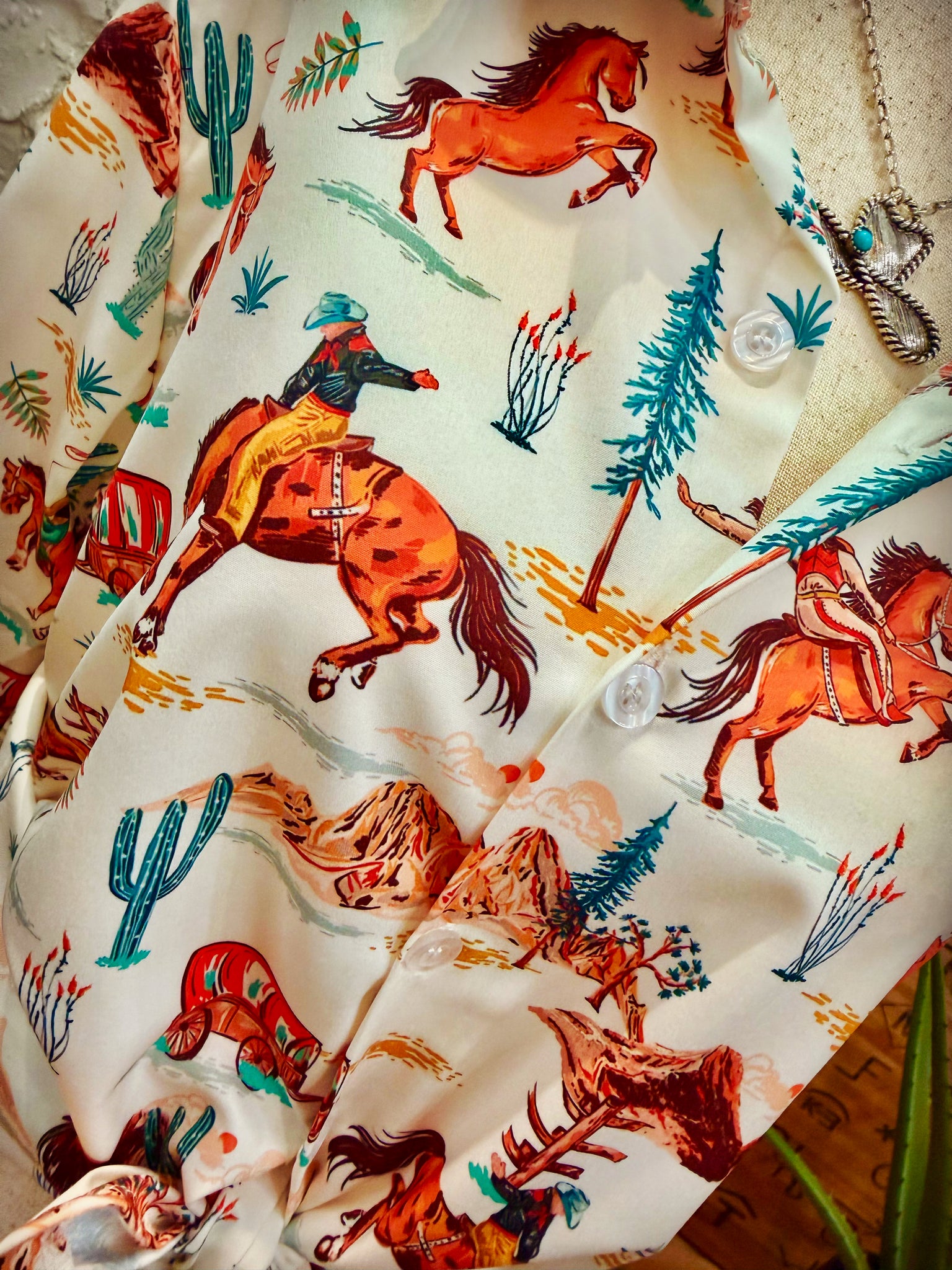 This super cute vintage cowboy button up top can be dressed up OR down!! Throw on a blazer or some shorts!! Fits true to size!!