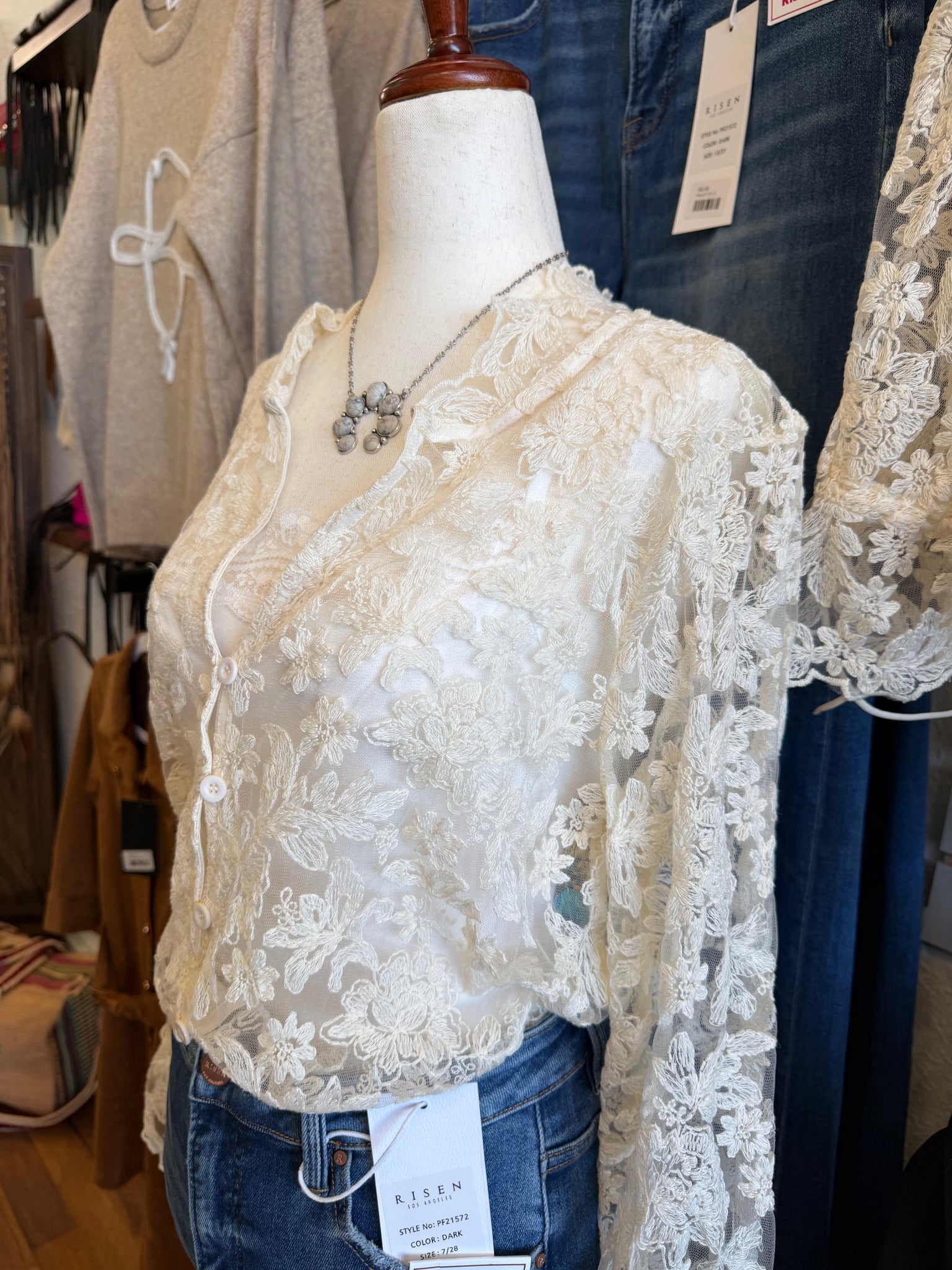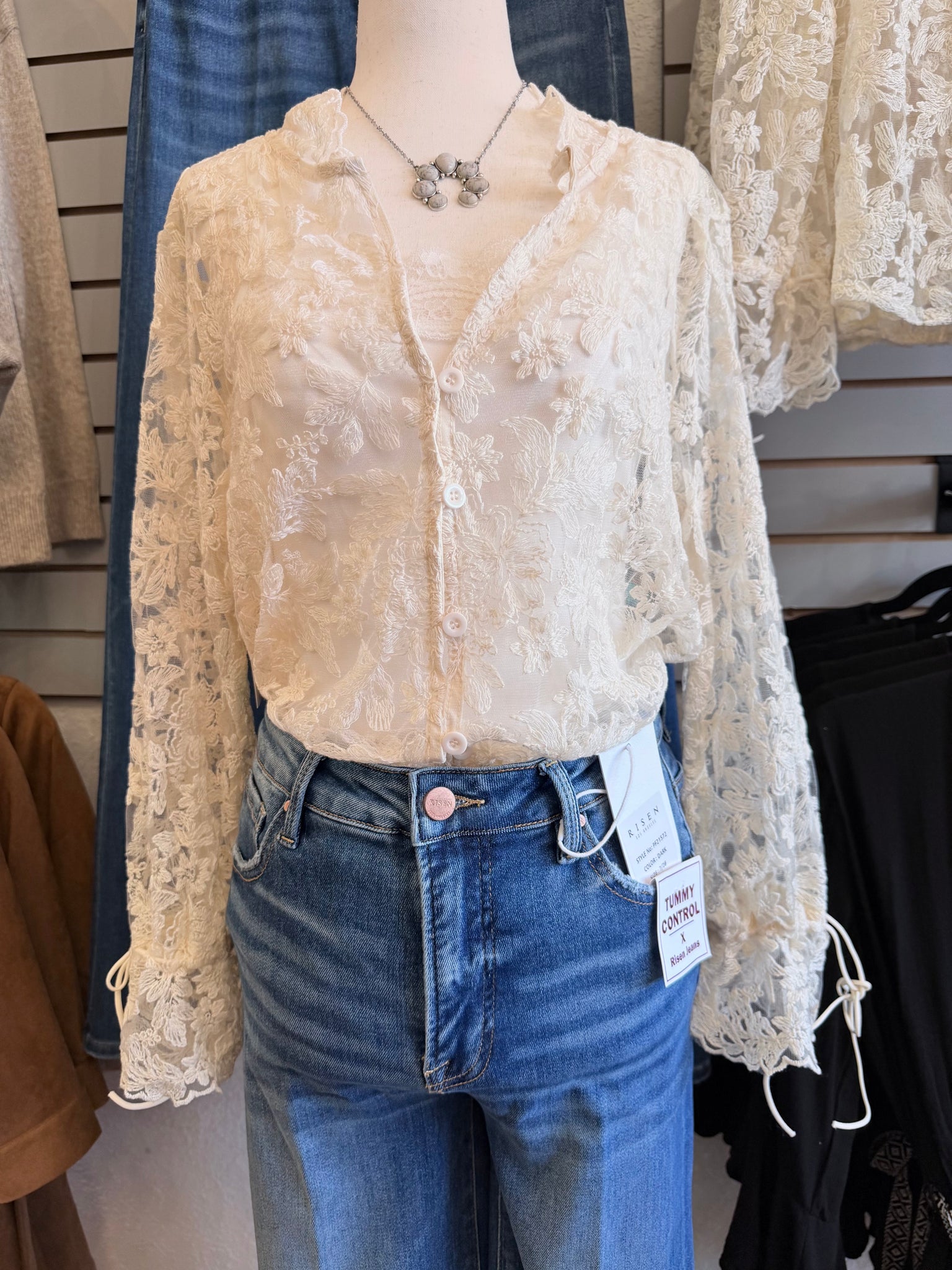 Love this lace top!! Super cute tie at the sleeves in an ivory color!! Add your favorite color cami underneath!! Fits true to size!!ย
